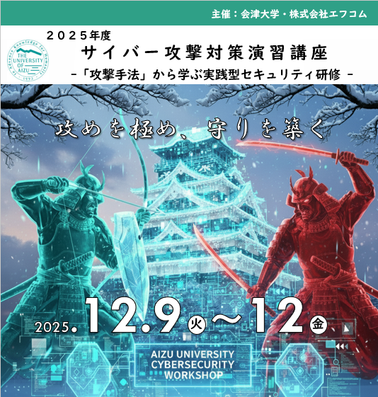 定員になり次第、締め切らせていただきます。 なお、定員に余裕がある場合、募集期間を延長して受付します。 講習会事務局までお問合せください。 参加申込書送付先 会津大学サイバー攻撃対策演習講座 事務局(株式会社エフコム 内) E-Mail s-sasaki@f-com.co.jp ※可能な限りメールでのお申込をお願いいたします。 FAX 024-922-2450 ※FAXでのお申込の場合は、TELにて事務局への受信確認をお願いいたします。