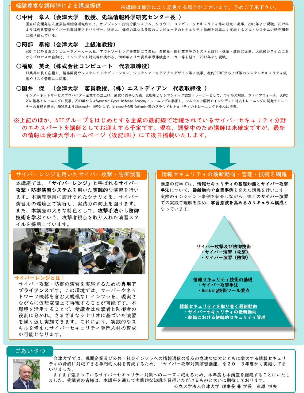 参加申込書裏面 「個人情報の取扱いについて」 をご覧いただき、同意されたうえでお申し込みください。 詳細はご案内チラシをご確認ください。 参考リンク 公立大学法人 会津大学お知らせ>2025年度サイバー攻撃対策演習講座開催のお知らせ)