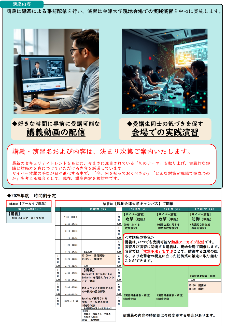 開催概要 ~2025年度「サイバー攻撃対策演習講座」~ -「攻撃手法」から学ぶ実践型セキュリティ研修-