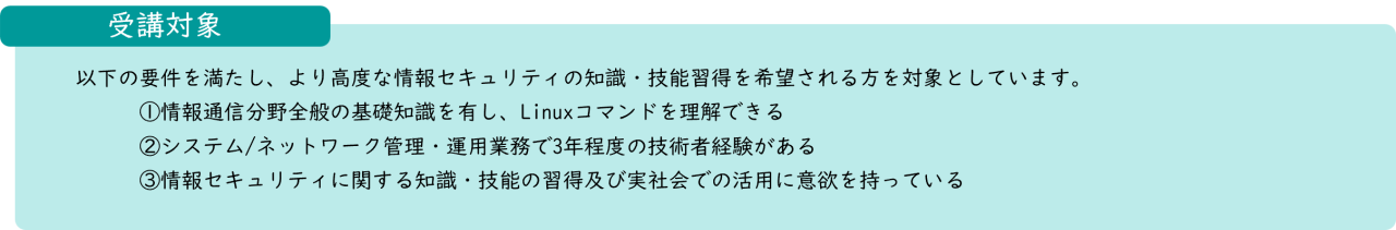 また、最新のセキュリティ動向を取り入れた講義と、専門家による実践的な指導を通じて、現場で役立つスキルの習得を目指します。