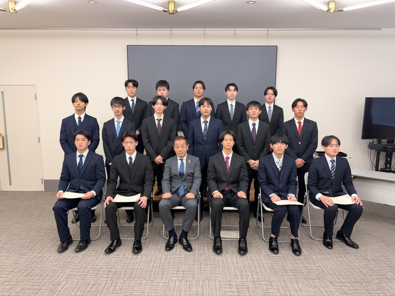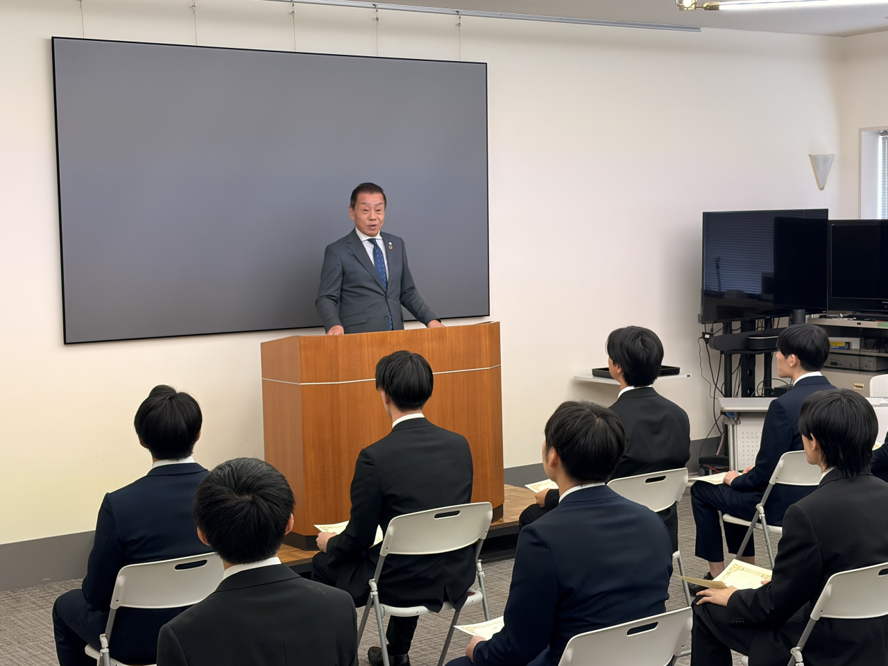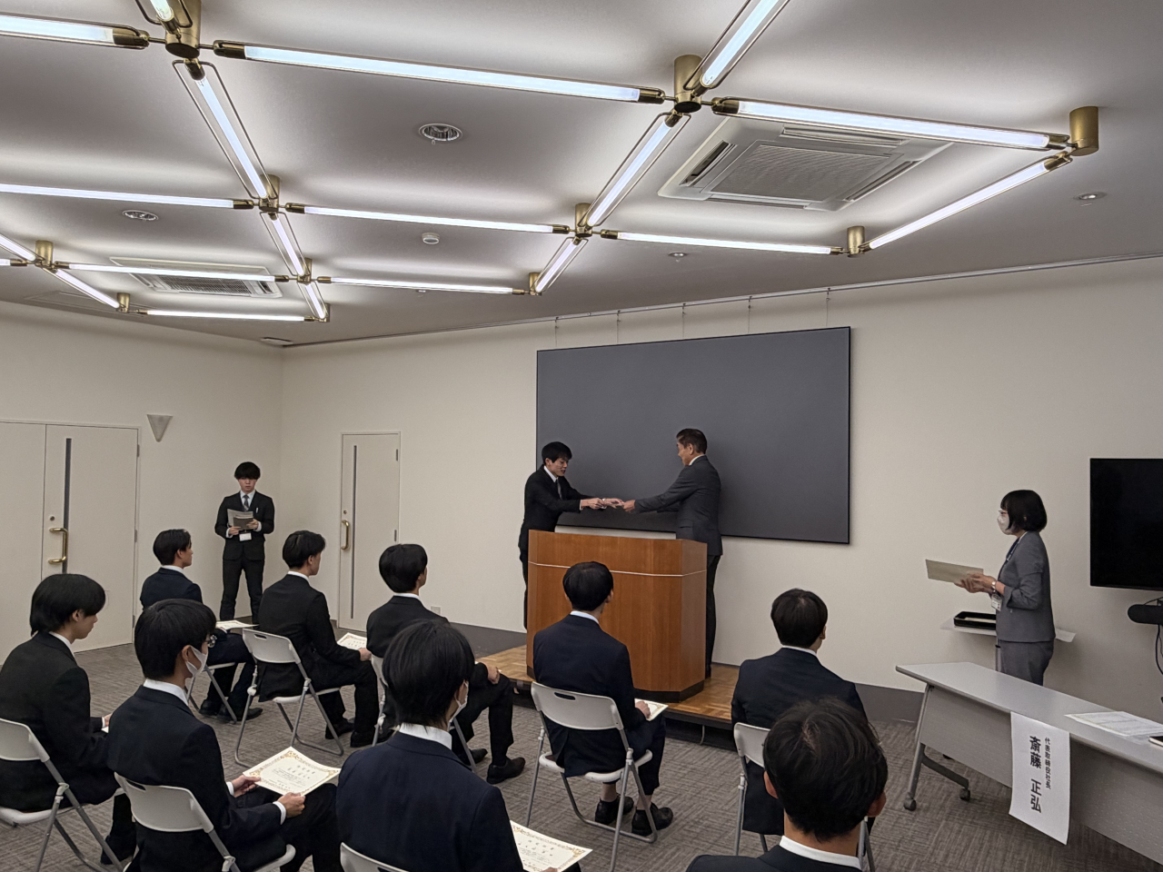 式典は、オリエンテーションに続き、社長より歓迎の言葉と今後への期待が述べられ、内定者一人ひとりに内定証書が授与されました。内定者の皆さんは緊張の面持ちの中にも、社会人としての第一歩を踏み出す決意が感じられました。